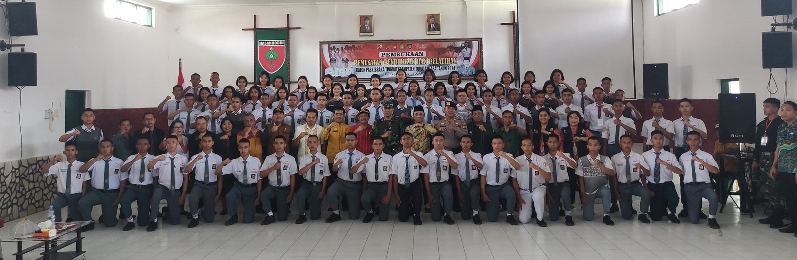 Foto bersama 75 anggota Paskibraka di Aula Kodim 1414/Tana Toraja untuk  persiapan mulainya mengikuti Pemusatan Pendidikan dan Pelatihan  (Diklat) Calon Paskibraka Tingkat Kabupaten Toraja Utara Tahun 2024, Kamis (25/7/2024).