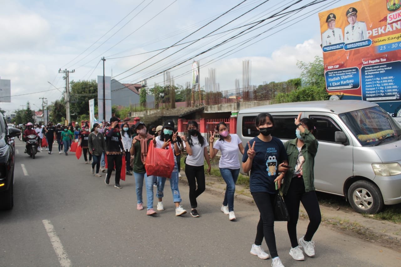 Nampak barisan mahasiswa/i STIKES Toraja dalam kegiatan jalan santai sambil pungut sampah di jalanan, Jumat (17/12/2021).