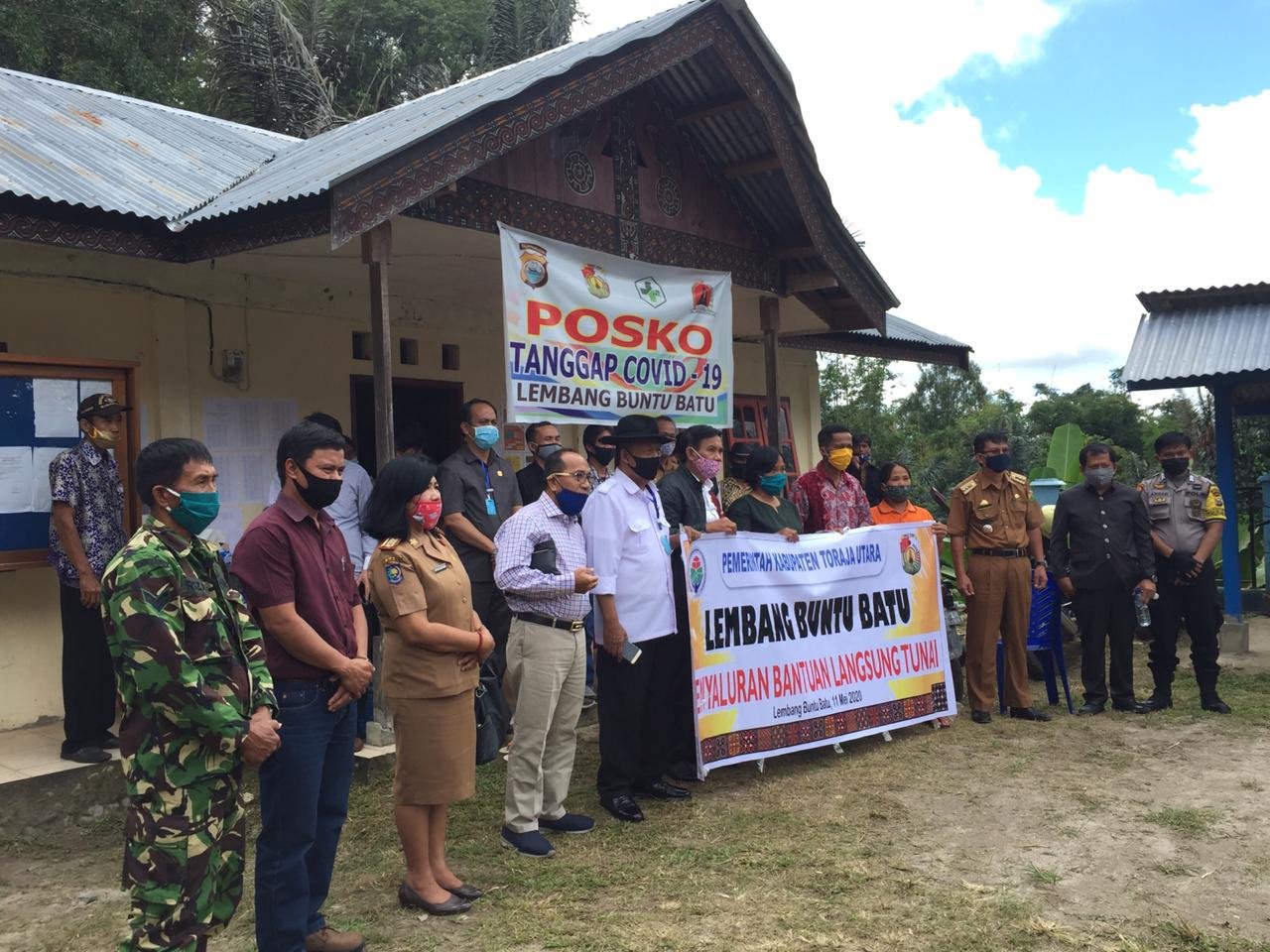 Torayapos.com-Toraja Utara,–Bupati Toraja Utara Kalatiku Paembonan didampingi anggota DPRD Toraja Utara, sekretaris Kominfo-Sp Yaya Rundupadang dan kepala Dinas DPML Rita Rasinan. menyerahkan Bantuan Langsung Tunai (BLT) secara simbolis kepada warga yang terdampak Covid-19, Senin (11/05/2020) di Lembang Buntu Batu.