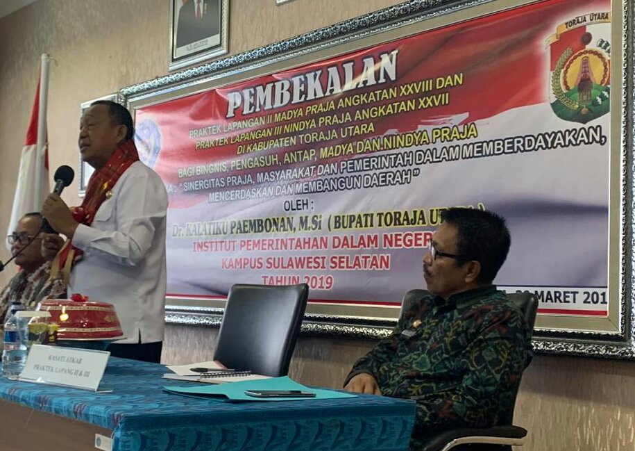 Saat kegiatan pembekalan tersebut Bupati Kalatiku bersama Direktur IPDN Kampus Sulsel Dr. Djouhari Kansil.M.Pd juga turut hadir Asisten Bidang Pemerintahan Setda Toraja Utara Drs. Semuel Samperompon, MM, Ka. BPBD Drs. Alexander Tappang, Kadis PUPR Toraja Utara Yorry Lesawengen, Kadis PMPTSP Dra. Mulyati S. Tikupadang serta para Camat dan Lurah yang wilayahnya menjadi lokus praktek Praja IPDN T.A. 2018/2019 ini. (basry)