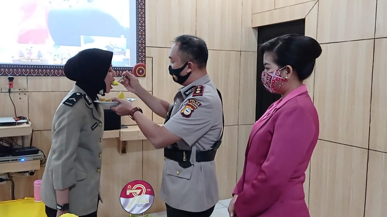 Liliek Tribhawono bersama Ibu Asuh Polwan Polres Tana Toraja memberikan suapan nasi tumpeng kepada Polwan termuda yang dimiliki oleh Polres Tana Toraja.