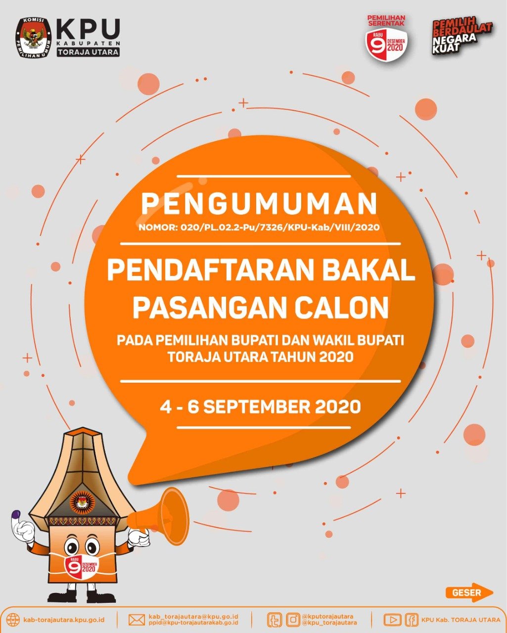 Keterangan lebih lanjut dapat diperoleh dengan menghubungi Helpdesk Pencalonan Komisi Pemilihan Umum Kabupaten Toraja Utara Jl. Taman Makam Pahlawan No. 65 Kecamatan Rantepao, email: kab_torajautara@kpu.go.id. (Basry)