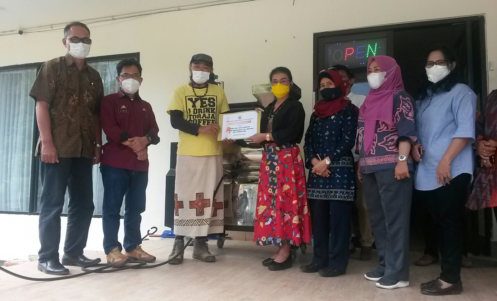 Nampak Dra. Firmina Tallulembang (tengah) menyerahkan bantuan roasting coffee pada salah satu pelaku usaha IKM kopi di Toraja Utara, Jumat (27/11/2020) di Wisma Ford Rotterdam, Tadongkon Kesu, Toraja Utara.