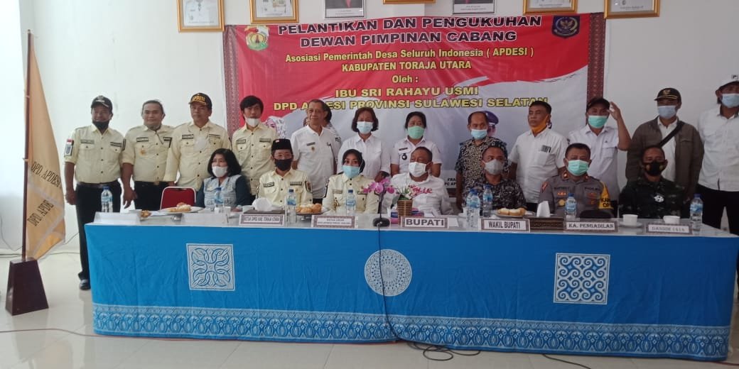 Pengukuhan itu dilakukan langsung Ketua DPD Provinsi Sulawesi Selatan, Sri Rahayu Usmi kepada Ketua Dewan APDESI  Kabupaten Toraja Utara Frans Derik Mangiri,SE, Kamis 25 Februari 2021 di Aula kantor gabungan Dinas/badan  Marante.