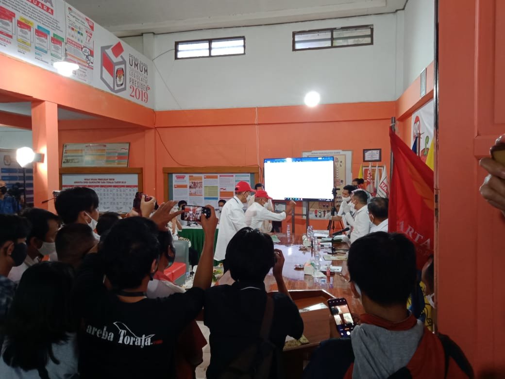 Selanjutnya pasangan Al-Jhon diterima oleh kelima komisioner KPU Tana Toraja dengan protokol covid-19.