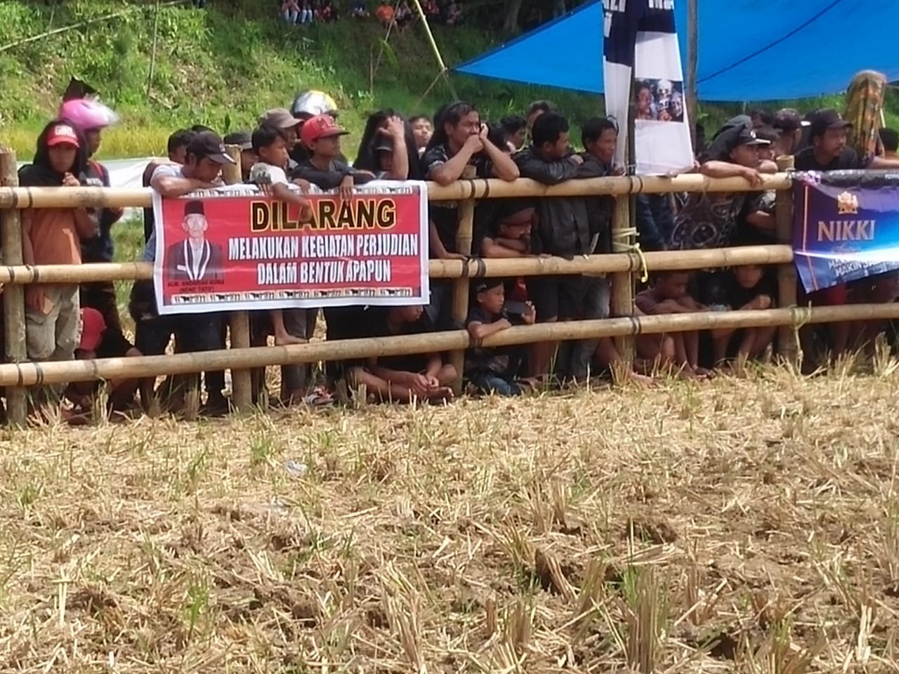 Dari pantauan , nampak sebuah spanduk merah yang bertuliskan “DILARANG MELAKUKAN KEGIATAN JUDI DALAM BENTUK APAPUN”.