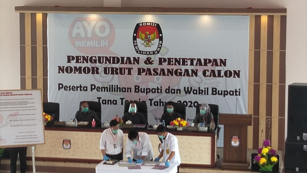 Torayapos.com-Tana Toraja,– Pengundian dan Penetapan nomor urut pasangan calon peserta pemilihan Bupati dan wakil Bupati Tana Toraja 2020 digelar KPU Kabupaten Tana Toraja di Hotel Metro, Makale, Kamis (24/9/ 2020) yang dipimpin langsung ketua KPU Tana toraja, Rizal Randa.