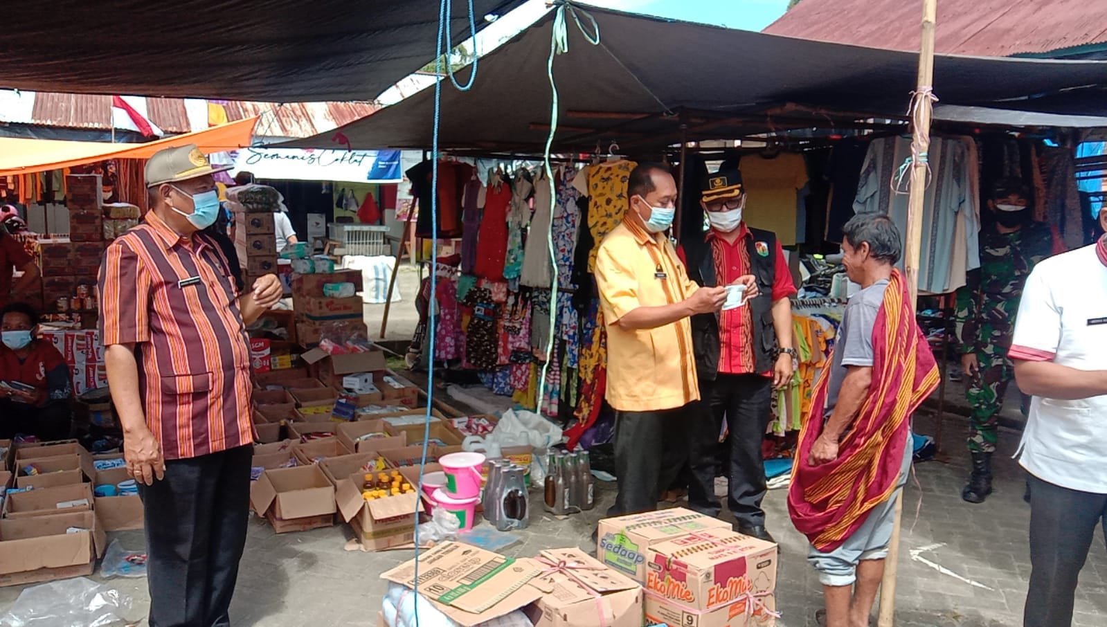 Usai penyerahan bantuan, Rede Roni Bare mengunjungi Pasar Tradisional Pangala’. Di pasar itu Rede Roni membagikan masker kepada para pedagang dan pengunjung di pasar itu yang tidak memakai masker, sekaligus memberikan sosialisasi terkait protokol kesehatan covid.