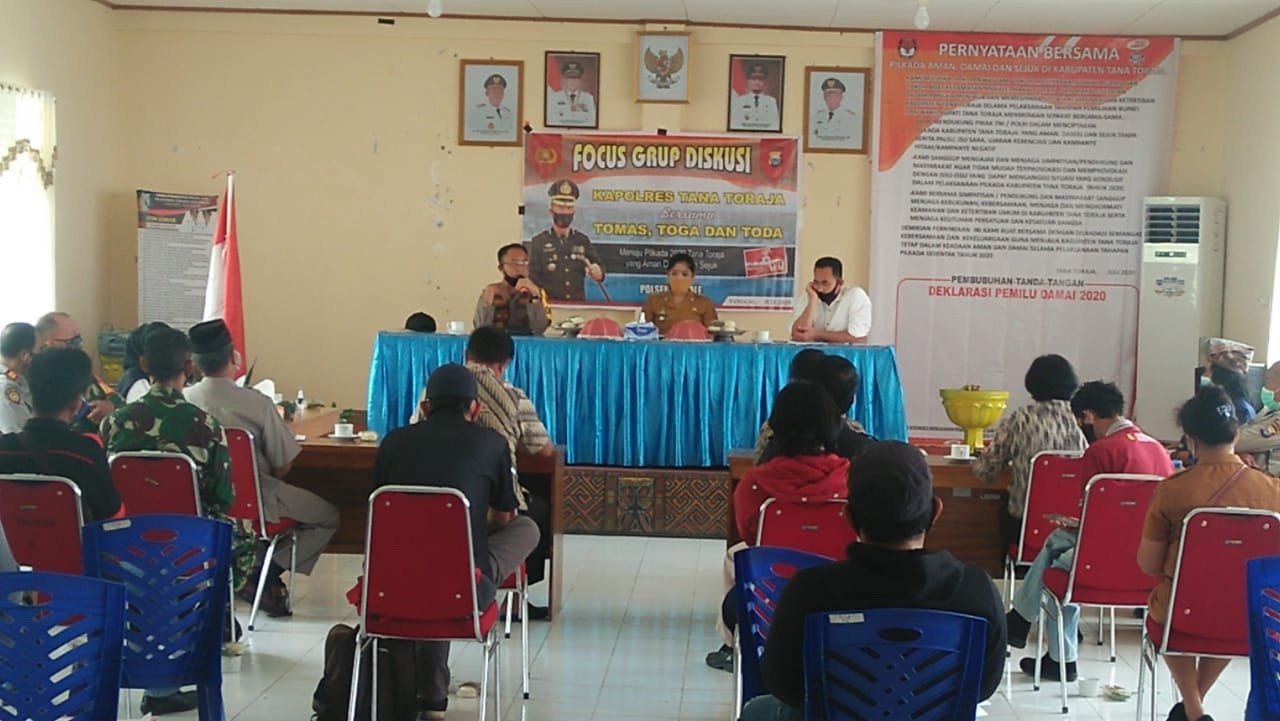 Torayapos.com-Toraja Utara, – Kepolisian Resort Tana Toraja laksanakan kegiatan Forum Diskusi Grup dengan mengundang Tokoh Masyarakat, Tokoh Adat dan Tokoh Agama guna menyatukan persepsi cipatakan Pilkada 2020 yang damai dan sejuk.