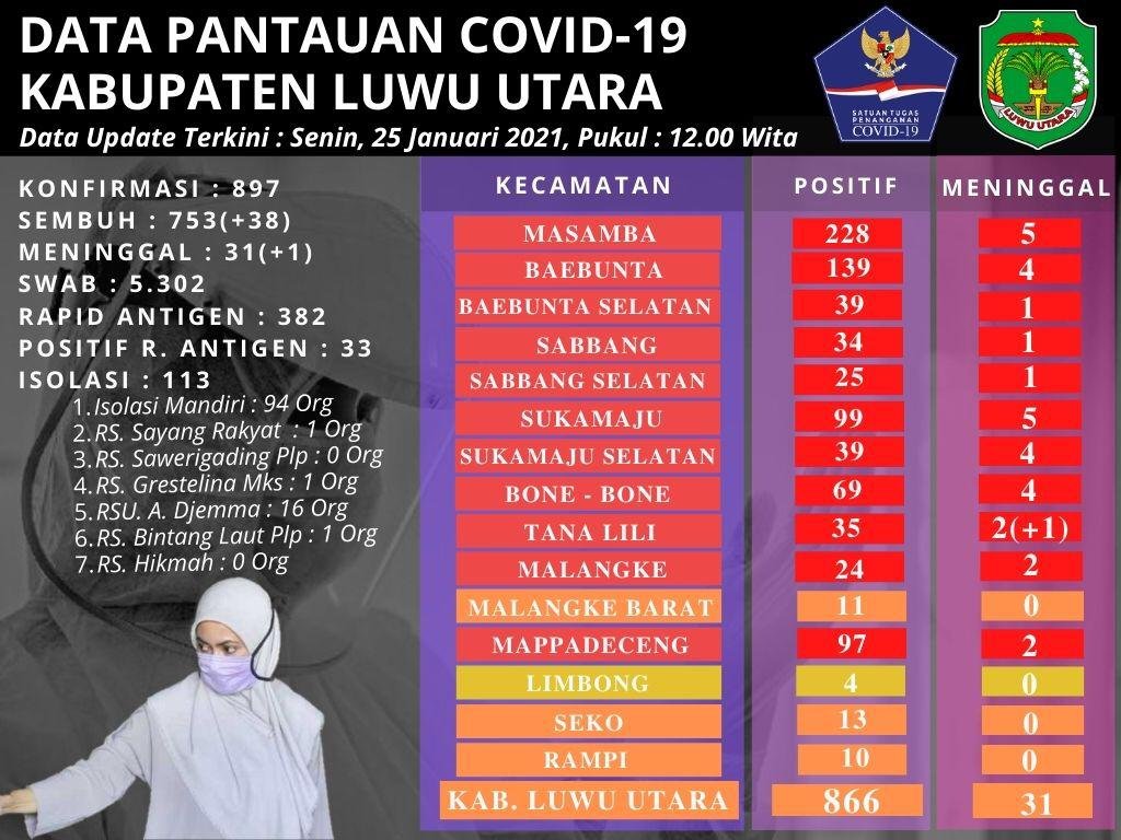 Dan jumlah per Kecamatan yang positif dan meninggal yakni, Kecamatan Rampi positif Corona 10 orang, Seko positif 13, Limbong 4,  Mappedeceng 97 meninggal 2 orang, Malangke Barat 11, Malangke 24 meninggal 2, Tana Lili 35 meninggal 2, Bone-Bone 69 meninggal 4, Sukamaju Selatan 39 meninggal 4.
