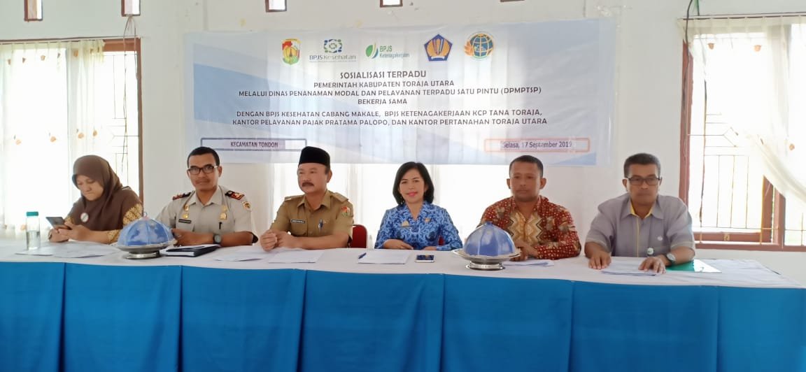 RANTEPAOPOS.ID-TORAJA UTARA,–Pemerintah Kabupaten Toraja Utara melalui Dinas Penanaman Modal Pelayanan Terpadu Satu Pintu (DPMPTSP) gelar sosialisasi terpadu kerjasama BPJS Kesehatan Cabang Makale, BPJS Ketenagakerjaan KCP Tana Toraja, Kantor Pelayanan Pajak Pratama Palopo dan Kantor Pertanahan Toraja Utara, bertempat di aula kantor Kecamatan Tondon, Selasa (17/9/2019), kemarin.