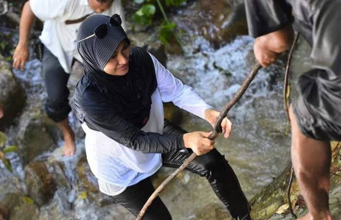 rantepaopos.id Luwu Utara — Bupati Luwu Utara, Indah Putri Indriani, melompat dari tebing setinggi 10 meter. Indah menguji adrenalinnya dengan melompat di atas tebing yang berada tepat di depan air terjun Bantimurung Bone-bone, Minggu 17 September 2017 pagi.