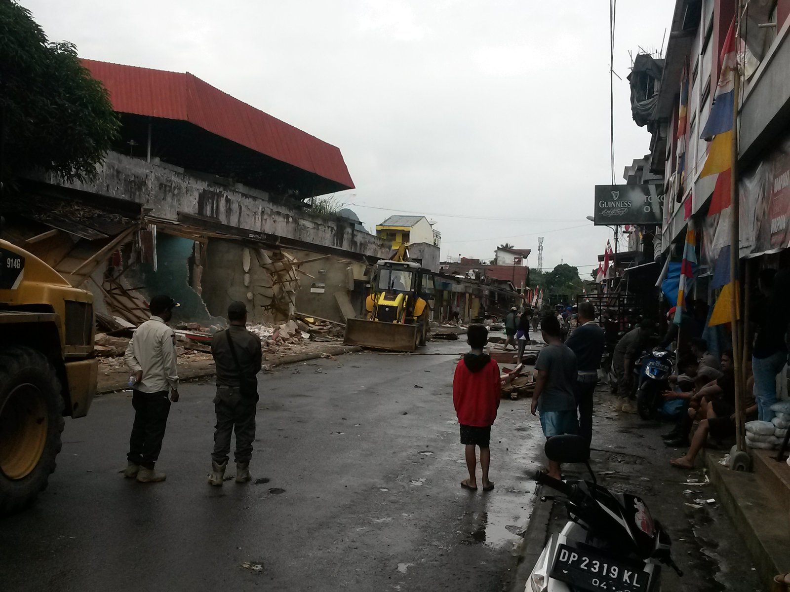 Juga terlihat personil Satpol PP bersama dengan pedagang melakukan pembongkaran, meski hujan turun proses pembongkaran terus berlanjut.