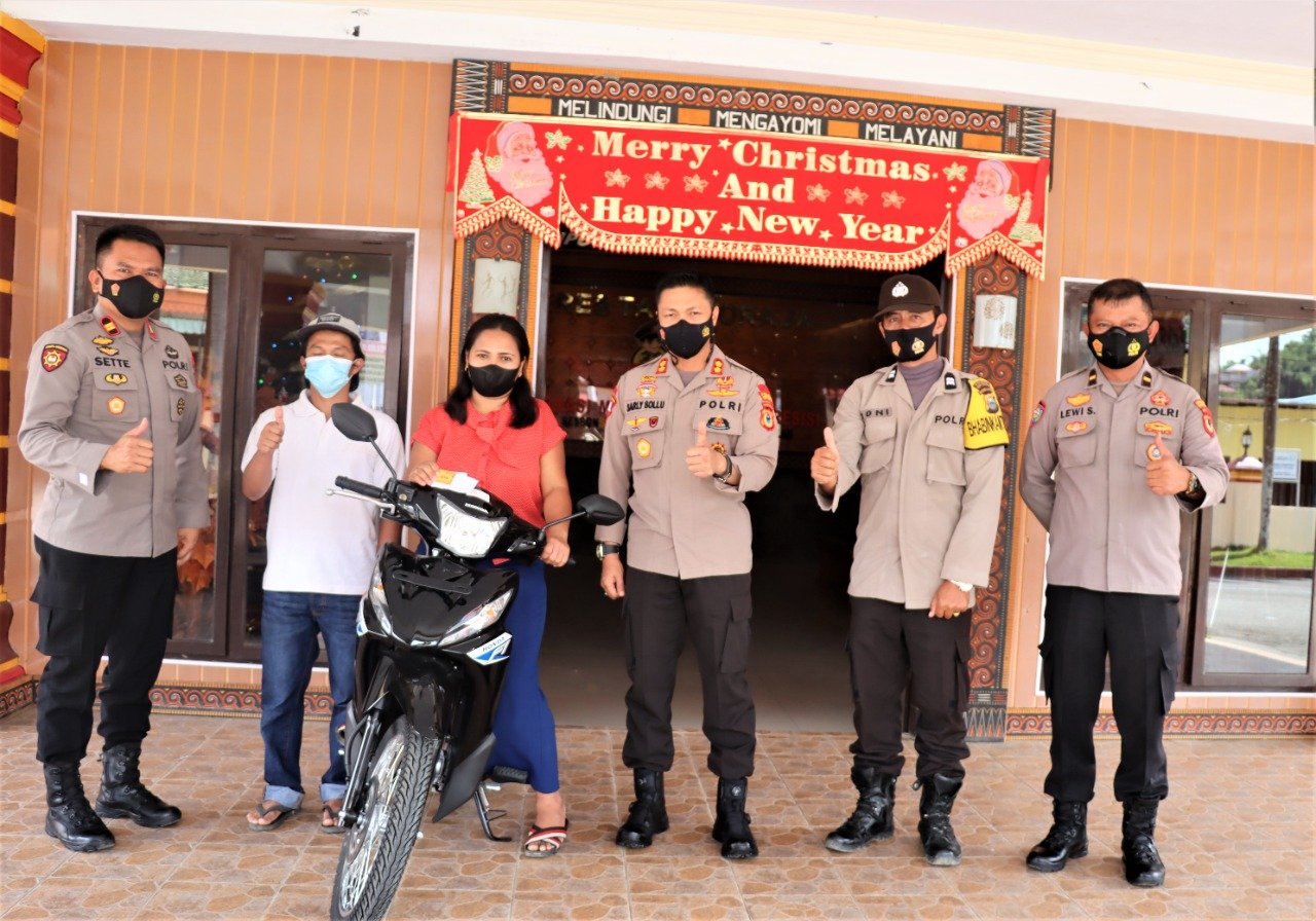 Rasa haru terpancar diwajah Ibu Agustina Basiang saat proses penyerahan sepeda motor oleh Kapolres, “terima kasih banyak Pak Kapolres atas hadiahnya saya merasa tidak percaya bisa mendapatkan sepeda motor sekali lagi terima kasih banyak tuhan memberkati,” ucap Agustina.