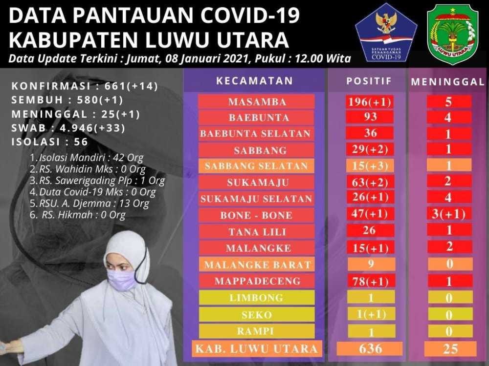 Torayapos.com- Luwu Utara,– Per 8 Januari 2021 Kabupaten Luwu Utara bertambah 14 warga terkonfirmasi positif corona virus, dan satu orang meninggal dunia di Kecamatan Bone-Bone. Dengan bertambahnya pasien terkonfirmasi corona virus tersebut, kini totalnya sudah mencapai 636 orang.